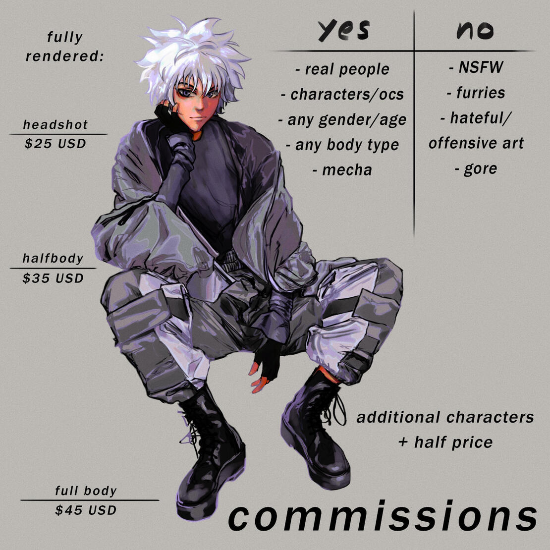 (be mindful if you want art by a certain date)- half-payment upfront, half after approved sketch- PayPal ONLY- personal use only ! — i am allowed to share/post any commissions i take (with credit to any ocs)- extra characters/people: + half price